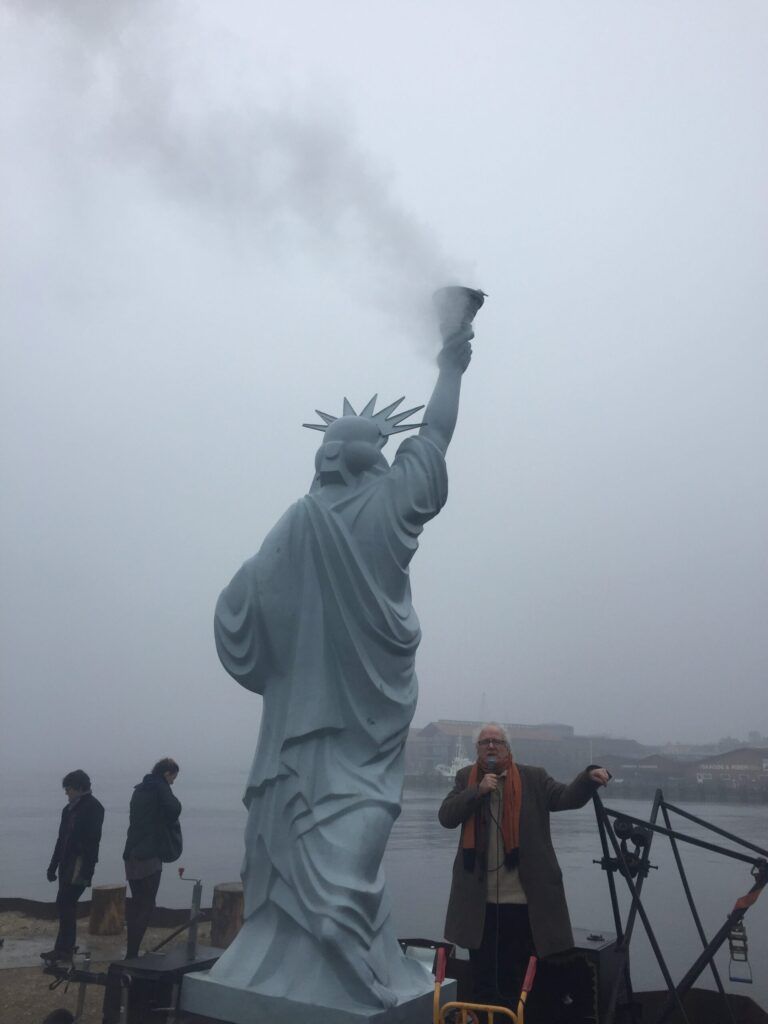 Her fra et Øko-net årsmøde hvor skulpturen stod ved indsejlingen til Svendborg Havn.