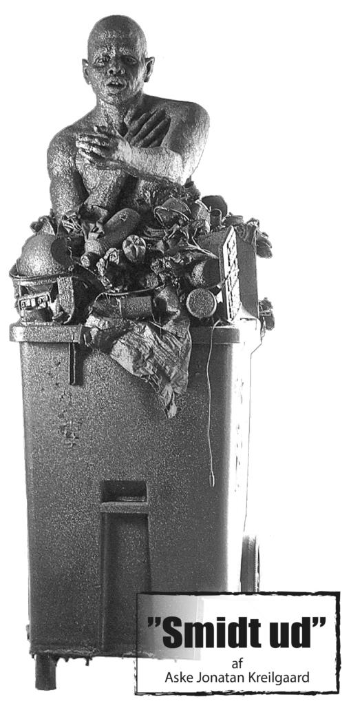 Antallet af mennesker på flugt er højere end nogensinde før, og selvom grænserne lukkes og ’ude af øje ude af sind’-mentaliteten blomstrer, er flygtningekrisen i dag en af de største globale politiske udfordringer. Med afbildning af en sudanesisk flygtning sætter ”Smidt ud” (2020) fokus på de usynliggjorte flygtninge, tvungne immigranter og asylansøgere. Ved ankomsten til Danmark bliver de placeret på bortgemte asylcentre og får frataget fundamentale rettigheder såsom retten til at arbejde og vælge sit eget hjemsted. I værket står en flygtning begravet til brystet i skrald, der både leder tankerne hen på raciale, sociale og økonomiske ulighedsstrukturer og på sammenhængen mellem flygtningekrisen og især vestens overforbrug og ressourcespild i kraft af køb-og-smid-ud- kulturen. I overfloden af skrald ses computertastatur og plastikkrus kasseret sammen med flygtningen og FN’smenneskerettighedserklæring; et konkret billede på, at mennesket i sig selv ikke længere tillægges nogen værdi. Affaldscontaineren bliver i denne forbindelse en form for anti-piedestal, der spiller på skulpturens traditionelle brug af sokkelen som ophøjende og hædrende.